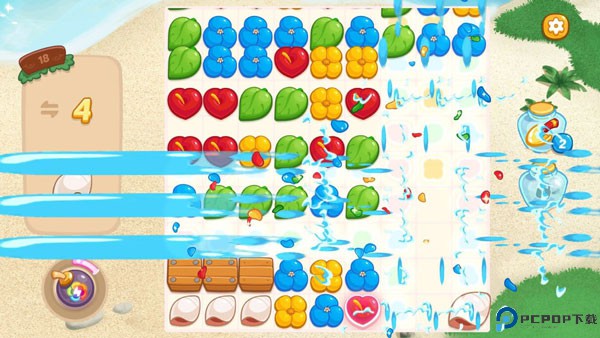 场上出现5个或是6个相同的元素相邻,点击后即可生成水流的道具,水流的主要作用是用来消除整排或是整列的元素,水流的方向会在每回合改变。
