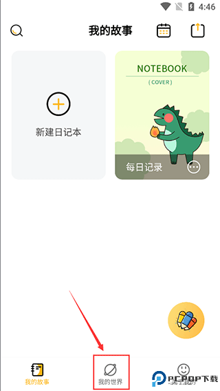 1、打开子墨日记app首页,点开下方【我的世界】页面