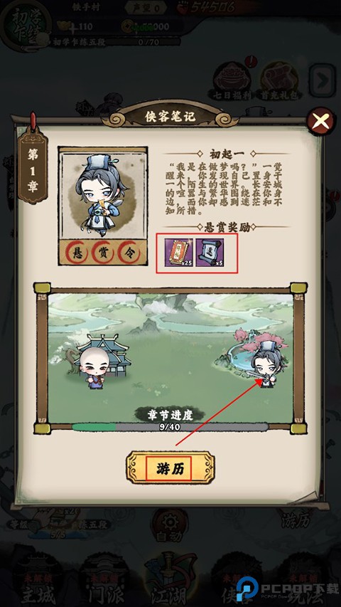 4、玩家还可以进行章节游历,在游历过程中玩家可以收获丰富资源,玩家需要将上方悬赏令敌人击败才能通过关卡。