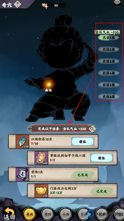 3、玩家通过招募、升级等,可以完成修炼任务,将所有任务完成即可打通穴位,提升修为。