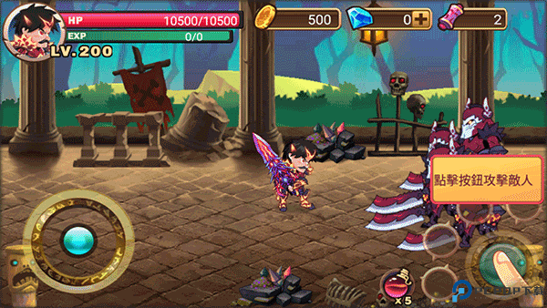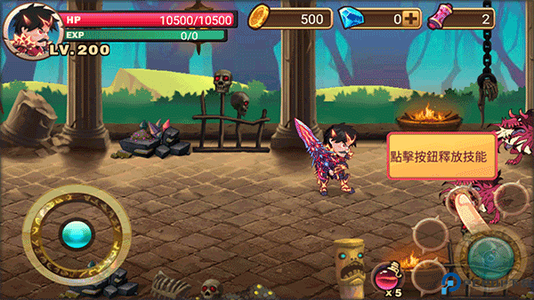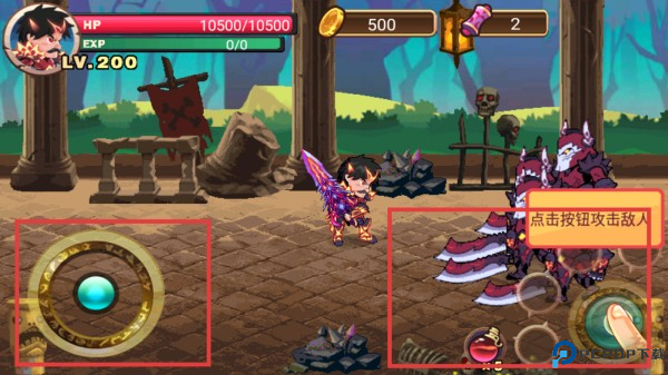 3、进入游戏后,通过左下角虚拟摇杆控制角色移动,右下角按钮控制角色攻击敌人,利用屏幕上方显示的生命值、金币等信息合理战斗。