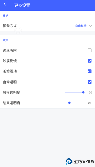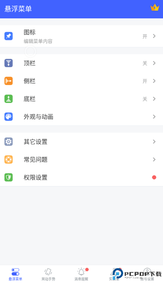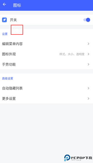 2、点击图标,进入设置页面,这里有控制悬浮窗的开关设置,开启时默认图标在手机左上有一个白色透明的圆环(需要手机设置允许开启悬浮窗权限才可显示出来),即为悬浮窗功能菜单,这里有很多的功设置