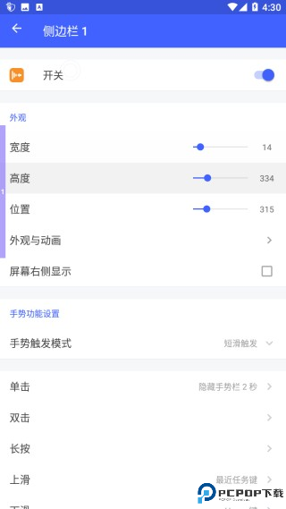 3、在"悬浮菜单"板块中点击侧栏(非正式版只能开启一个侧栏),点击侧边栏1进入如图所示,功能开启,上下左右滑动、单击双击作用都在本页面,还可以根据自己的喜好更改
