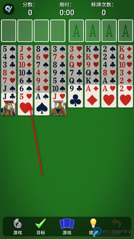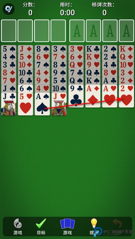 从列到列(或从可用单元到列)。在列中必须按降序依次放牌,而且红黑花色交替。
