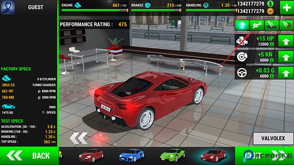您可以通过改变齿轮比,底盘高度和车轮外倾角定制你的车。你可以升级你的引擎,刹车,以及处理有更好的表现。一些身体和边缘的颜色也可供您选择。