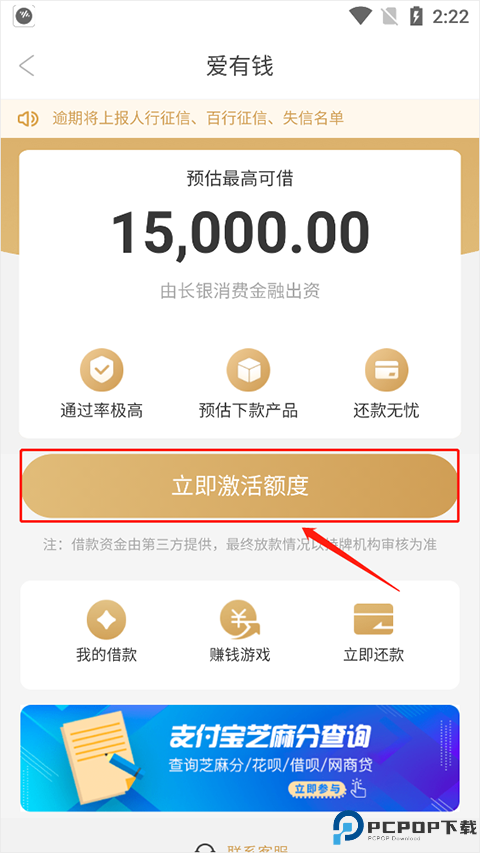 2、在“爱有钱”页面选择“立即激活额度”按钮即可,当然借款是需要先实名认证的哦。