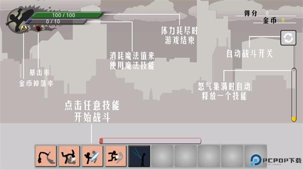 3、然后点击下方的任意技能就可以开始战斗;在开始战斗之前可以点击右上方的自动战斗开关(也可以不开,这个可以依据自身喜好来设置),当上方绿色的血条耗尽的时候,游戏结束;