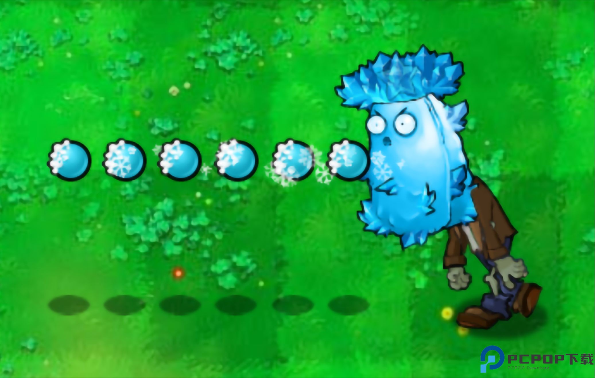 3、缓慢向前移动,沿途对所有植物造成碾压伤害。当走到第三列时会跳起返回原位,落地后再次触发冰冻效果。