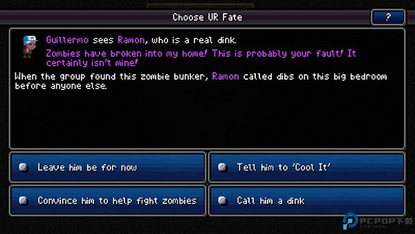 1.开局人物选择:建议开局带两个人物,一个战斗属性的,一个辅助属性的。辅助属性的人物必须有,他的嘴炮(魅力)、个人风格、冷静程度、忠诚全是满的,而且医疗和修车技能也不低,是通关的关键。