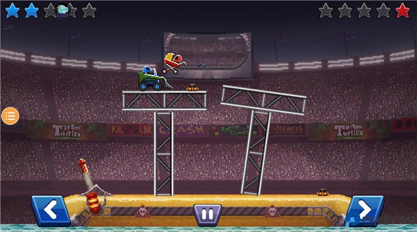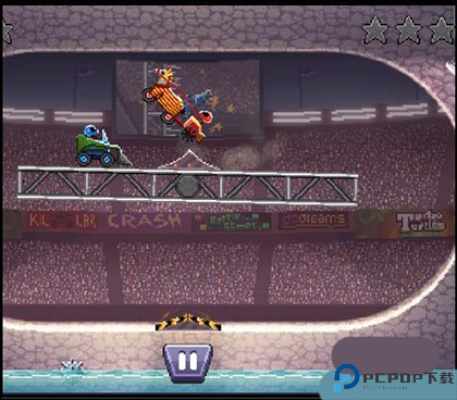 4、像这样在高塔上的场景,玩家需要先稳住赛车不要掉落下来,再去找机会撞击对方,一掉掉落那肯定赛车会解体,从而丢掉积分