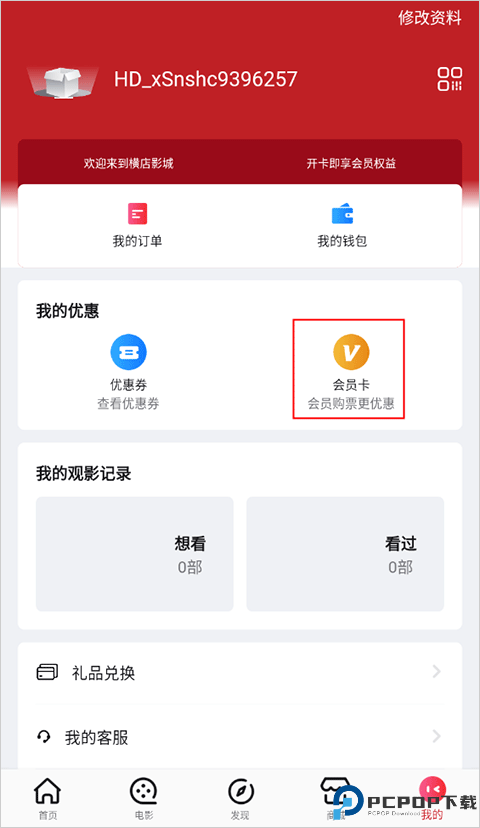 1、进到横店电影城app,在我的界面点击“会员卡”
