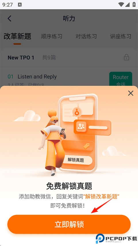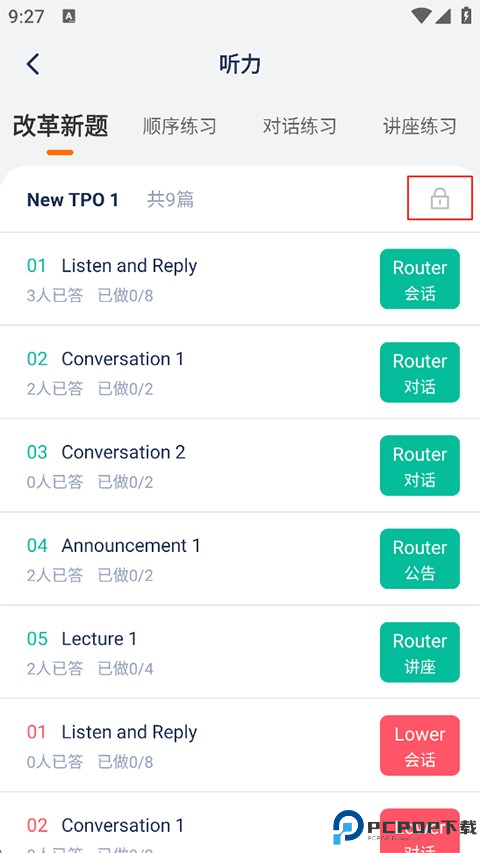 2、在听力模块下方选择需要练习的题型,如“改革新题”,点击右侧的解锁图标;