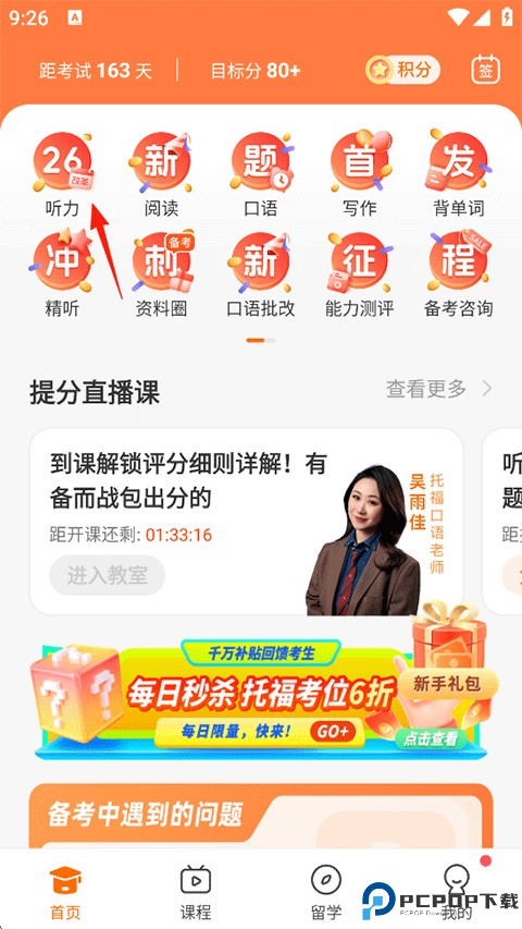 1、打开小站托福APP,在首页点击想要解锁练习的题目模块,如“听力”;