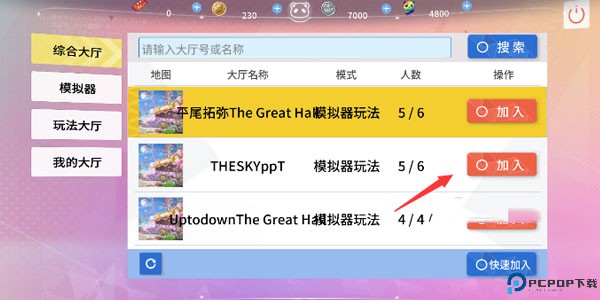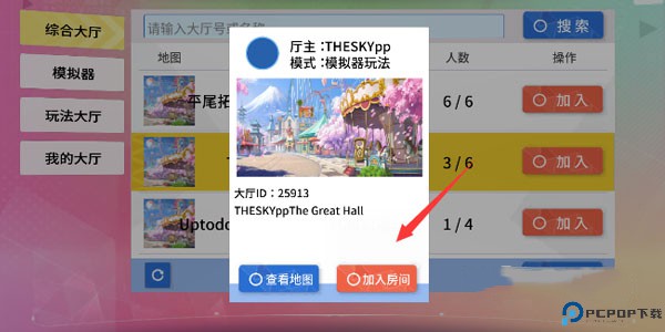 2、进入大厅之后,选择自己想要的进入的联机房间,通过搜索可以找到好友的房间,
