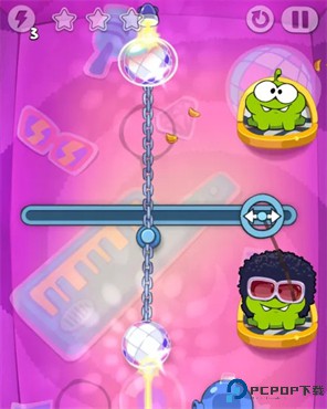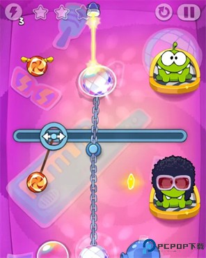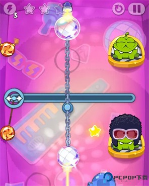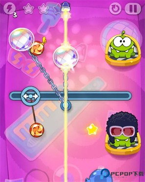 第三关:先把最左边的绳子切断,让其撞击右边的糖果,如此即可过关。