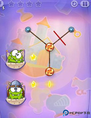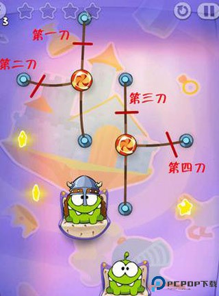 第四关:左边的糖果先切竖直的线,吃到星星后就切断最左边的线。右边的绳子同理。