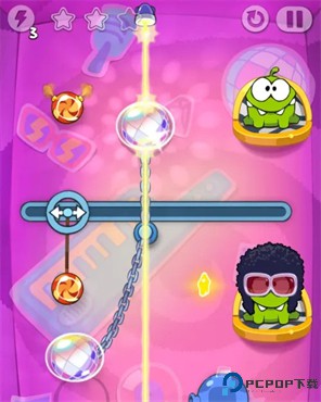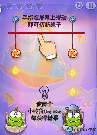 利用重力和惯性,精准割断绳子,让糖果落入怪物嘴里。