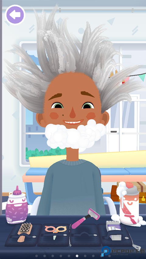 基础的理发模拟游戏,玩家可以为顾客设计发型,使用剪刀、电推剪等工具。