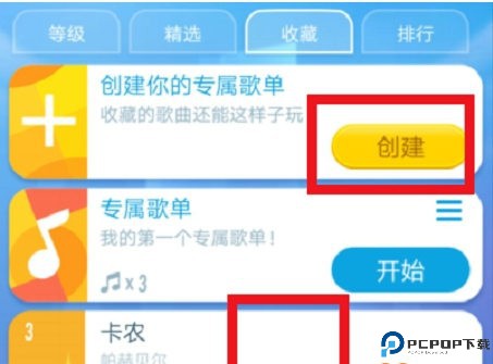 4、在钢琴块主界面上框,有收藏的白色字样,如果收藏了任意三首,就可以创建歌单。而在每首音乐中只要感兴趣就可以点击心状物标,即可以完成收藏。