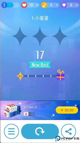 4、歌曲最后结束后会评级,分为1至3颗星星和1至3颗皇冠,三个皇冠的得分最高,也最难达到。