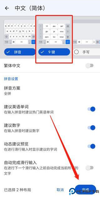 5、顶部就可以看到九键的标识了,点击就可以增加九键,如果不需要全键盘也可以取消勾选全键盘,只用九键,设置完成后,点击底部的完成即可。