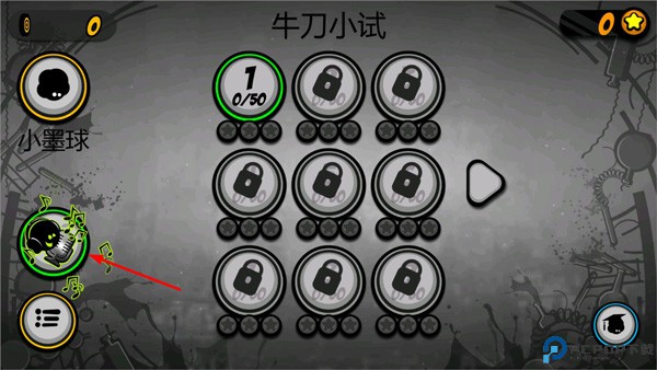 2、点击开始后打开关卡页面,在该页面中玩家可以切换墨点角色,点击左侧的音乐按钮;