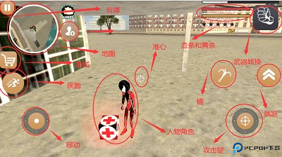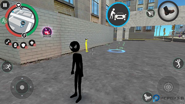 5、点击左侧的摇杆可以控制火柴人进行移动,点击右侧的钩子可以化身蜘蛛侠自由穿梭,点击“人”的图标可以跳跃,点击瞄准镜图标可以进行攻击。