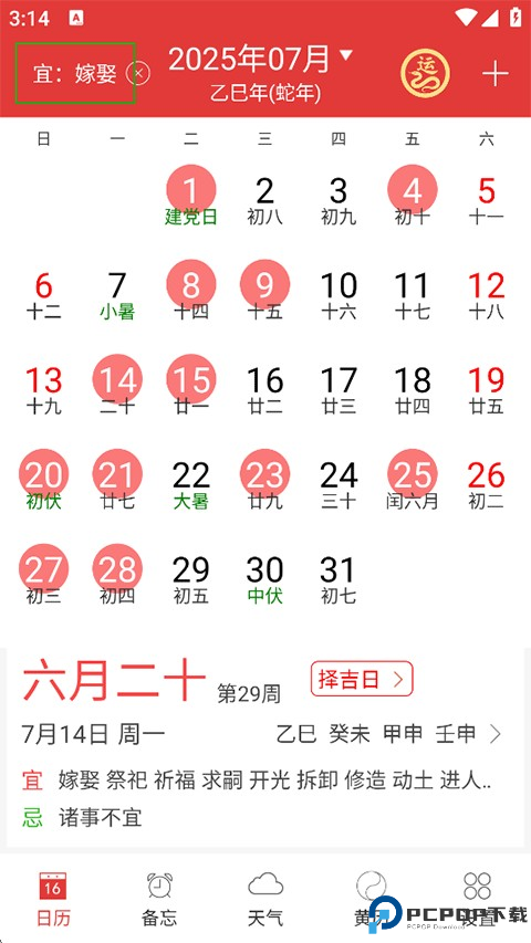 4、页面中标红的日期即是“宜:嫁娶”的黄道吉日;