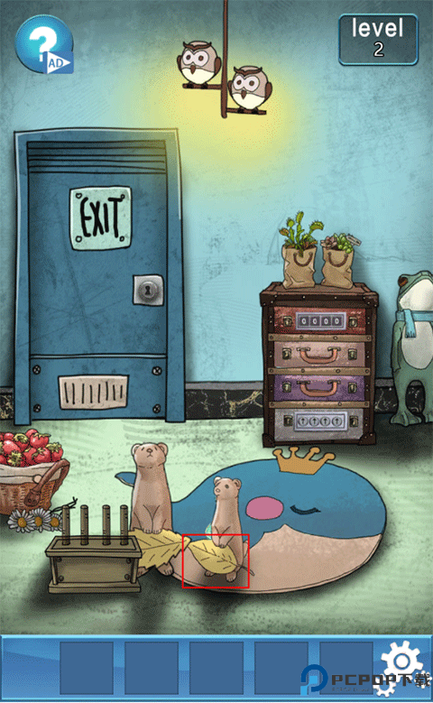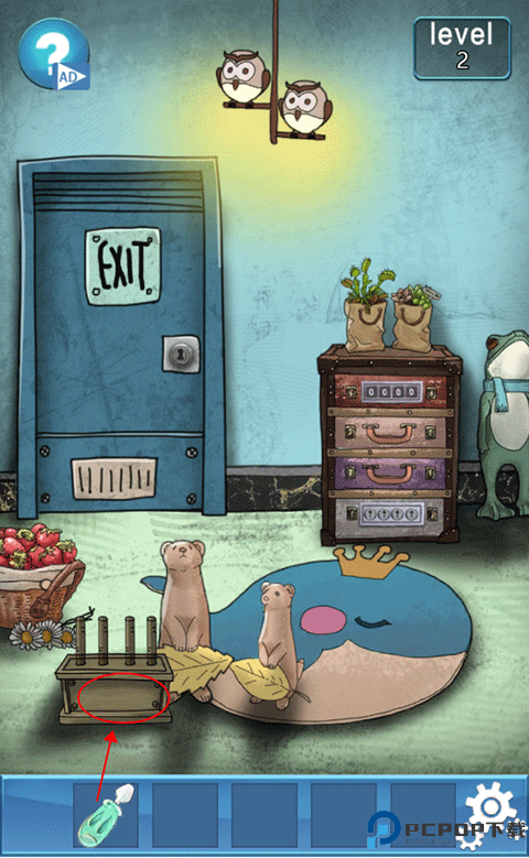 1、点击如图所示位置小动物手里面的螺丝刀。之后使用螺丝刀将左下角的柜子打开。