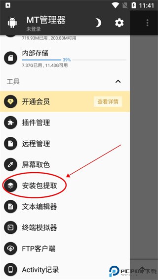 1、打开MT管理器,点击左上角选项并点击安装包提取;