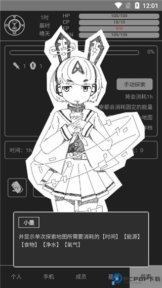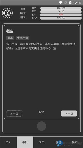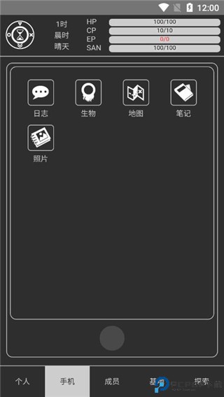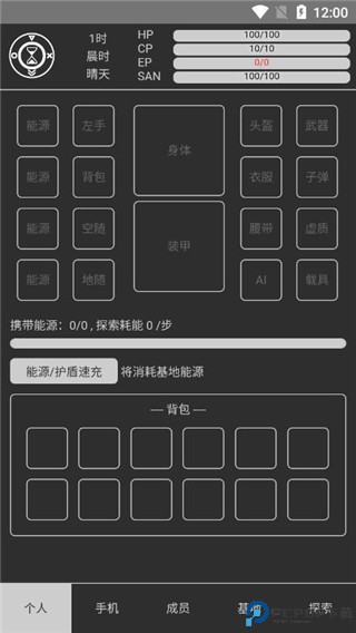 3、HP代表生命值,生命值为零时,将会重启游戏;CP代表护盾值,可以通过基地能量补充;EP代表能量值,每次探索都会消耗固定的能量;SAN代表理智,理智太低,说不定会发生奇怪的事情
