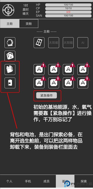 1、初始的基地能源,水,氧气需要靠【紧急操作】进行操作,干万别忘记了。背包和电池,是出门探索必备,在离开逃生舱前,可以把这两样物品卸载下来,装备到装备栏里面去