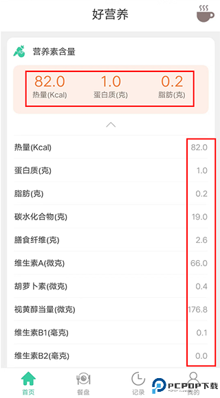 3、查看营养元素含量:根据食品库的标准数据,得出所称食品的热量、营养元素含量。