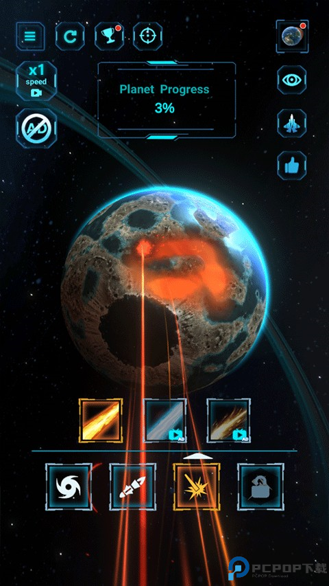 2、进入游戏后,玩法非常简单,玩家需要通过下方的激光以及道具来摧毁星球;