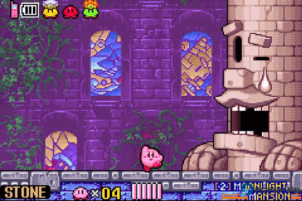 4、生命:你所操作的卡比剩余的生命数,每当健康值到达0或是坠入深渊时,生命数就会减少1,在生命数未到达0之前,每次减少都会把你送回刚进入这个房间的地方,而当生命数达到0并且再次下降时,变回把你送回镜之国的入口。