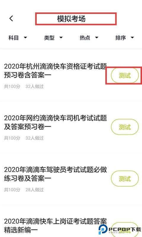 2、点击模拟考场,筛选科目、类型等条件,选择试卷后点测试,启动模拟考试流程。