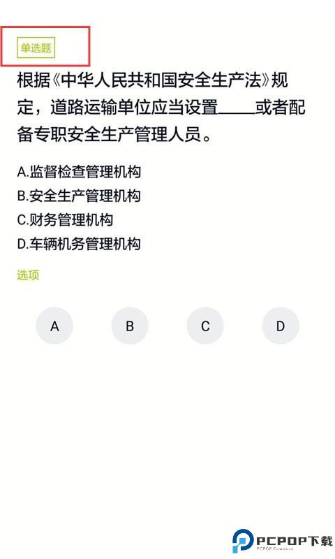3、在答题界面,识别单选题题型,依据题目,分析选项后点击对应按钮作答。