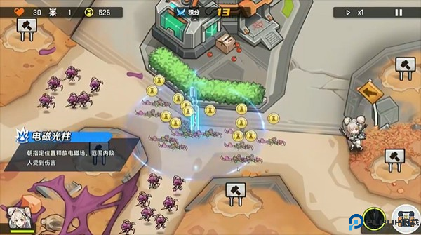1、怪物会在红圈的地方出现,玩家需要在地上立着标牌的地方建设机关、发射炮和盾牌等武器。通过打怪获得金币,再用金币升级武器以面对下一波更强势的怪物。
