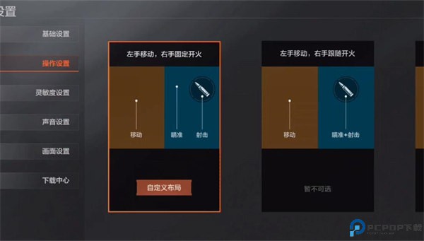 2、点击第一个“自定义布局”,进入自定义布局界面,将原本位于屏幕右上方的设置按钮拖拽到屏幕的中间位置,根据自身的需求调准设置按钮的位置和大小遗迹透明度。