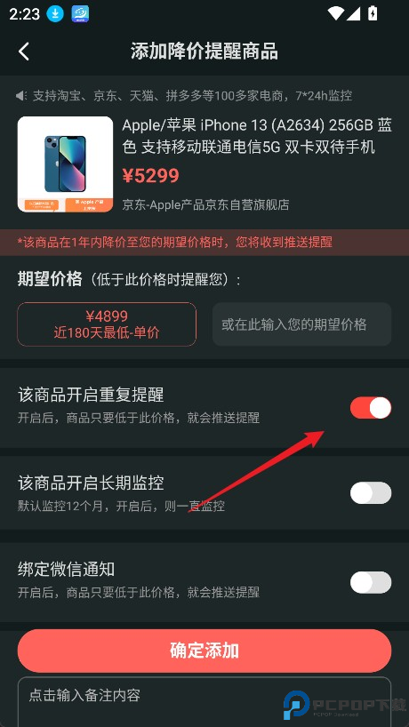 4、开启提醒后确认添加,商品降价会第一时间通知你。