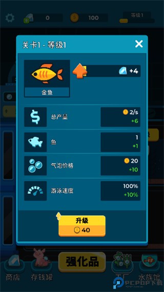 3、通过升级小鱼等级,玩家能增加收益,金币则来自卖出氧气瓶。
