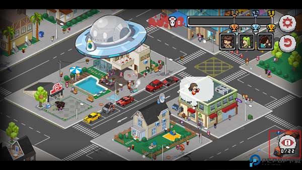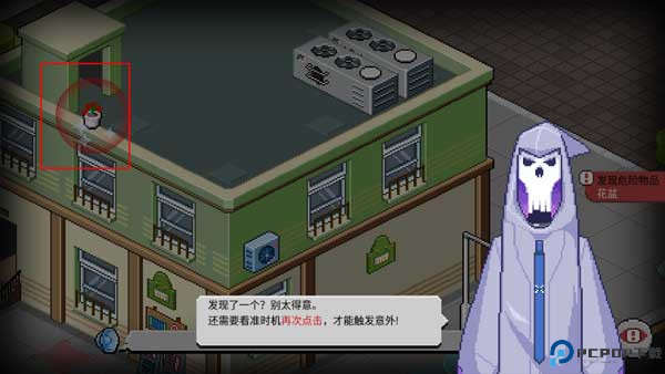 4、下面就是发现并“点击”场景中的“危险物件”。比如楼顶的花盆,当人出现在花盆掉落的区域,就可以再次点击花盆将人砸死。