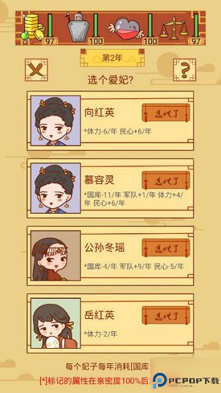相信你们在随便玩玩的过程中会发现,有些属性会像脱缰的野马往下掉,拉也拉不住,这时候,可能有的人会找妃子,生孩子,但是你们有没有发现…每个妃子和孩子都要减一国库。