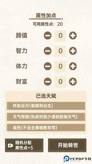 在这里你并不是一个转世直接当皇帝的人,而是一切重新开始,从一个刚刚出生的婴儿开始走出自己的新旅程。不同于其他的重生,我们在进入游戏的开始可以选择为自己能力加点,加点的方向有很多,从十条当中进行选择,再下来就是对自己的个人属性的加点。