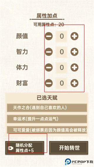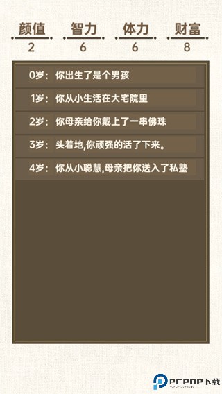 加点分为智力,体力,财富,长相,我们可以根据自己的想法来进行加点,不过上面两个加点还是希望能够慎重考虑并且相互结合一下,毕竟未来的方向也会因为你的这些选择而发生重大的转变。随后就是我们的出生,一岁一岁的长大,并在每个时间点发生千奇百怪的事情,直至我们的转世过来的人生走向尽头。