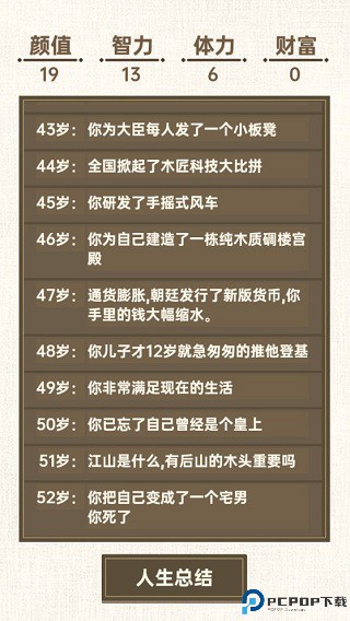 转世皇帝模拟器以高随机性的人生模拟玩法为卖点,玩家在游戏中仅能决定自己先天获得的天赋以及自己的四项属性加点(没有幸运呜呜呜。),并在一切皆有可能发生的高随机性事件中见证一系列精彩纷呈或者诡异到让人摸不着头脑的人生,简单的玩法带来的是无穷的乐趣,在轻松愉快的氛围中还可充分放松心情。
