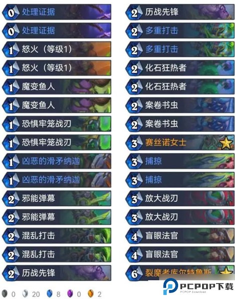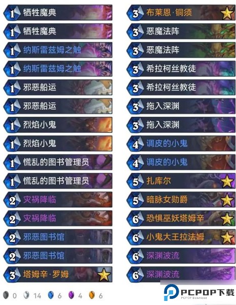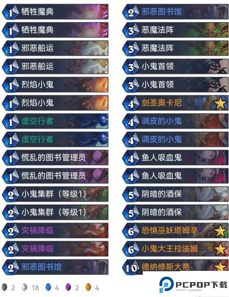 小鬼诅咒术是一套在诅咒术基础上加入了小鬼术体系的卡组,是目前表现最强势的卡组。小鬼诅咒术是一套变速卡组,前期利用小鬼术体系抢血、过牌,依靠灾祸降临强大的过牌能力,我们能很快找到诅咒体系的卡牌。即使前期的场面被解掉,小鬼诅咒术也可以突然掏出铜须+希拉柯丝教徒的Combo来补充伤害斩杀对手。