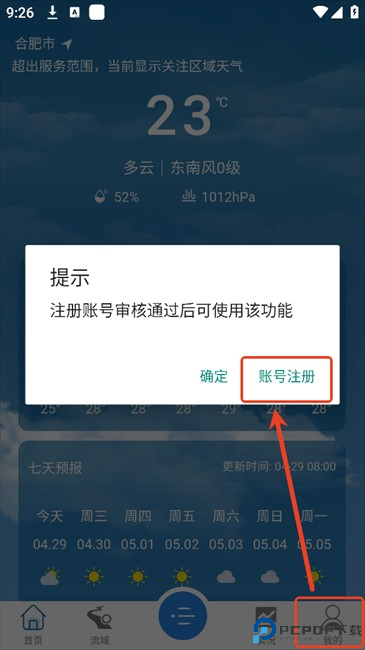 2.大部分功能都需要登录账号并审核,所以先点击【我的】,在跳出的弹窗里点击“账号注册”