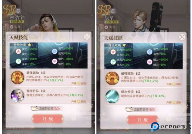 每个SR以上伙伴升级之后会解锁的天赋技能,SR100级解锁只有一个,SSR200级还会解锁一个。每个伙伴技能是不一样的,会在不同的系统里派上用场。比如说辰星的就是减少能量消耗,这个有点鸡肋,前期有剧情榜的时候有用后期就用处不大了。林浩宇的则是和羁绊蓝颜偶遇是,心悦值增加10%,如果王亦瑾是你的主养蓝颜,那这个加成还是不可小觑的。主养伙伴和主养蓝颜一定要搭配好,一个动另外一个也一定要动。蓝颜技能加成还是挺可观的。伙伴招募-达达、申泽宇(有点经济能力的搞这个)(个人觉得也是颜值比较高的)这两个藏得比较深,需要在出门的大世界里兑换,而且很难很快拿到,兑换道具目前只在冲榜活动、名媛会3级之后的兑换商店里有(扑克牌和唱片)。