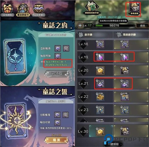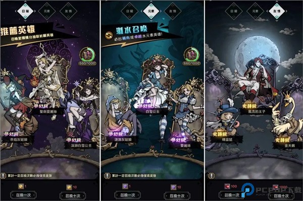 微氪党建议:只氪启示录和月卡,尤其是小月卡。启示录里面有专有英雄彼得潘,在前期能提升过图速度并且英雄试炼中刷碎片很关键。其次启示录里面有很多稀缺资源,如觉醒材料,后期巨缺。小月卡多一次英雄试炼,英雄试炼阵容成型可以一把刷25-40的紫卡碎片,每天多一把还是多很多的。跳过也可以极大节省时间。大佬:随心情。觉醒材料和抽卡石头可以优先考虑。三、抽卡抽卡有三个池子,活动的时候可能还会多个活动池子。